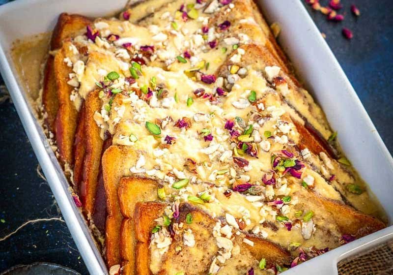 Indulge in Double ka Meetha, a delightful Indian dessert made with deep-fried bread soaked in sweetened milk and flavored with aromatic spices. This luscious treat is garnished with nuts and offers a perfect blend of textures and flavors.