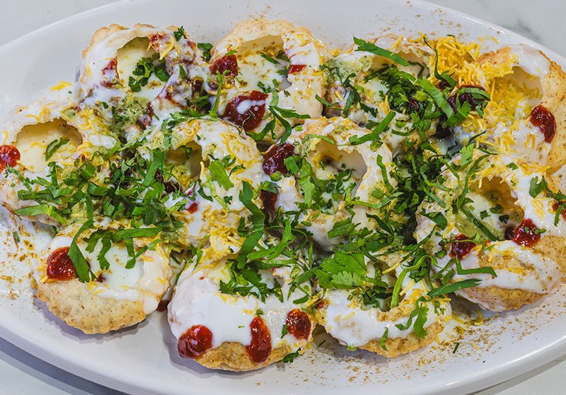 ← Go BackStuffed puris topped with yogurt, chutneys, and mild spices for a refreshing taste.