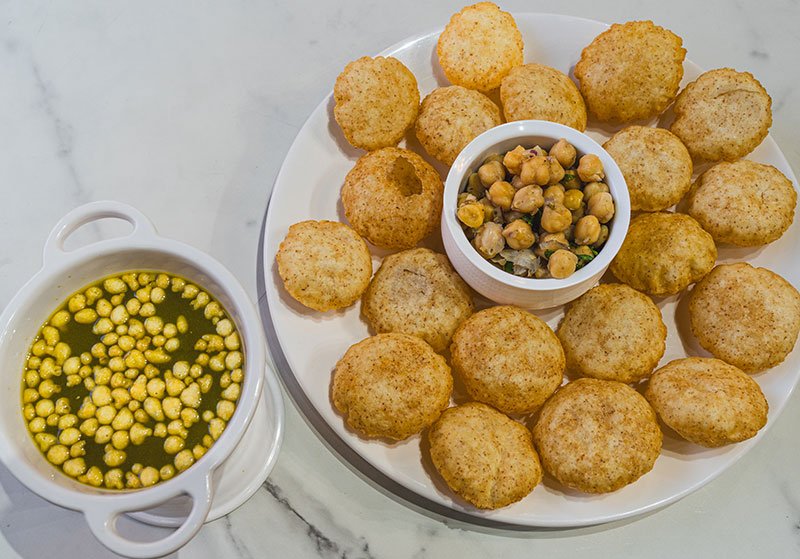 Crispy puris filled with spiced water, potatoes, and tangy chutneys.