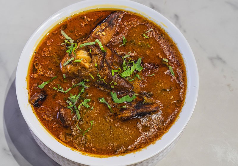 Slow-simmered goat trotters cooked in a traditional spiced broth with deep flavor.