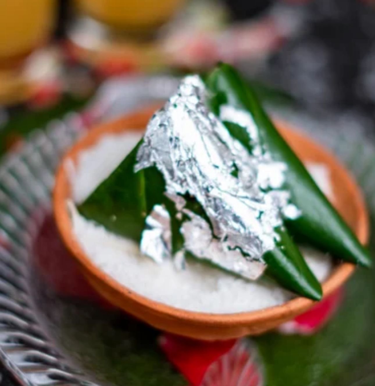 Betel leaf filled with sweetened ingredients, nuts, and aromatic flavors.